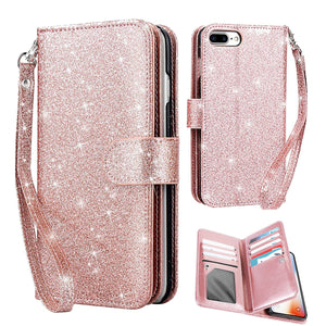 Glitter Sparkly Bling Cute Shiny PU Leather Flip Folio Wallet Cover with 9 Card Slots Wristlet